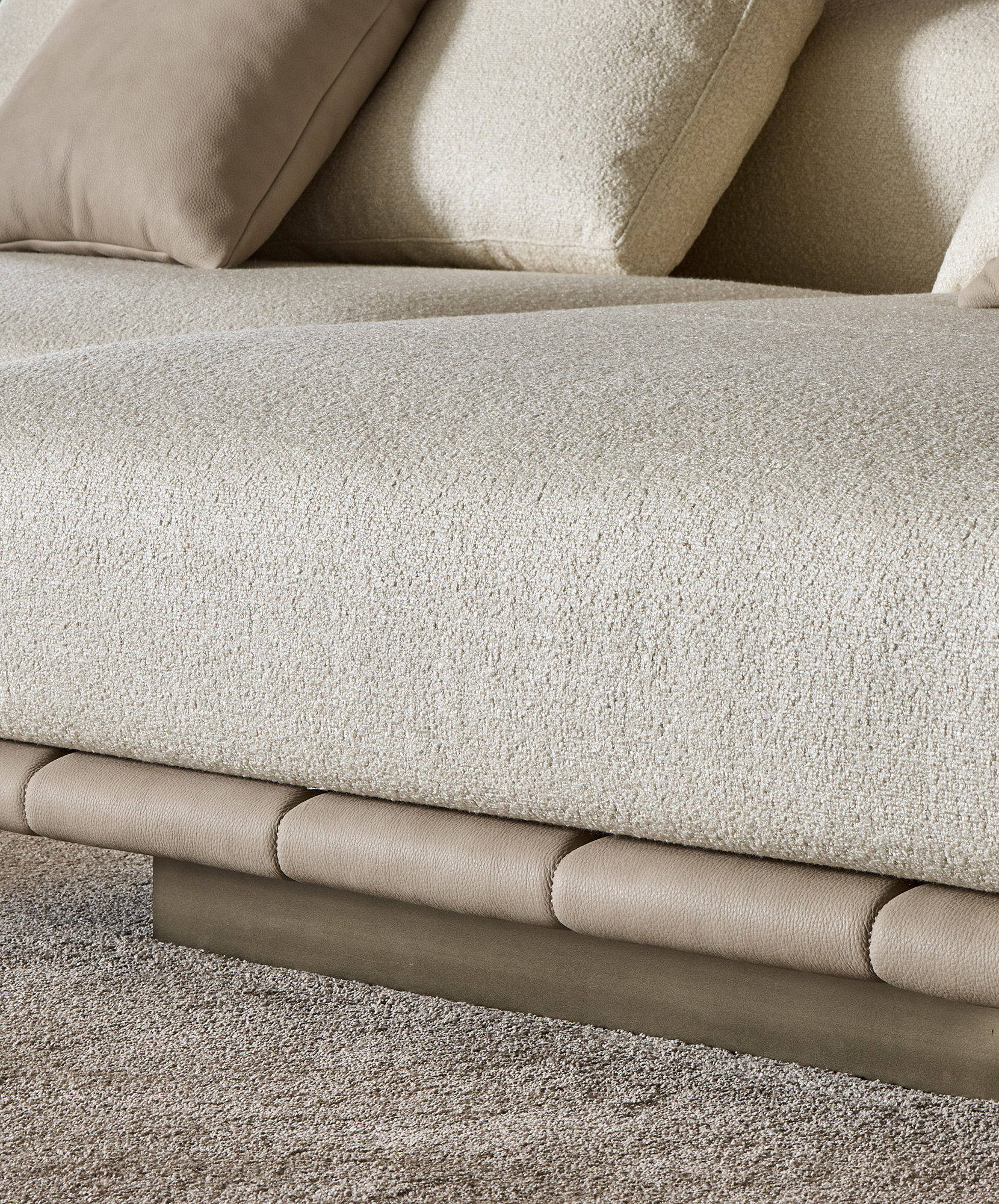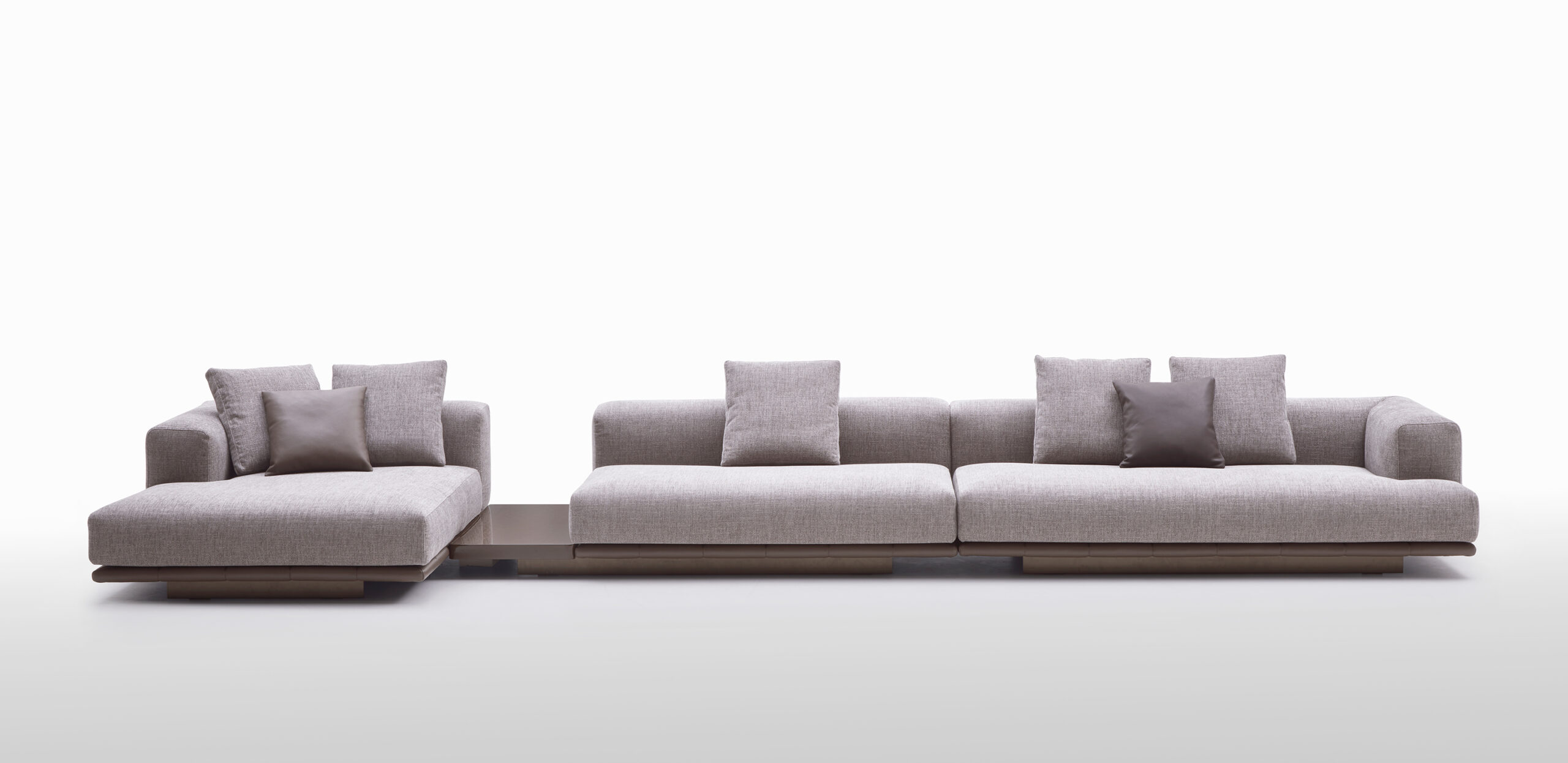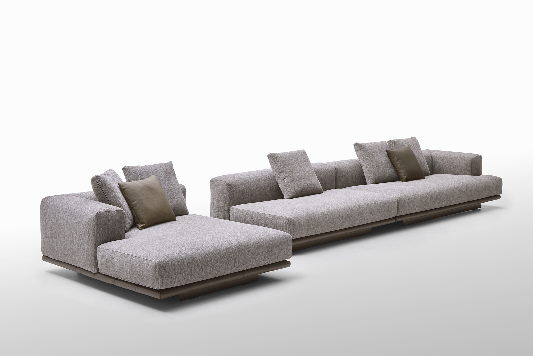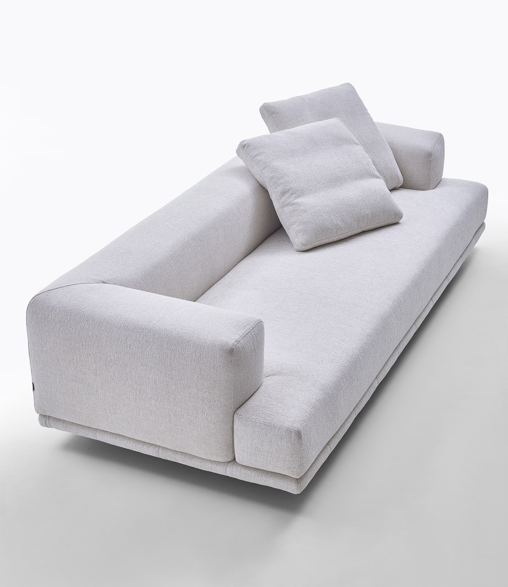 Le sedute ampie e profonde si combinano con schienali lineari e cuscini morbidi, creando un equilibrio perfetto tra rigore formale e sensazione di relax. La base trapuntata, sottile e leggera, caratterizza visivamente l’insieme.