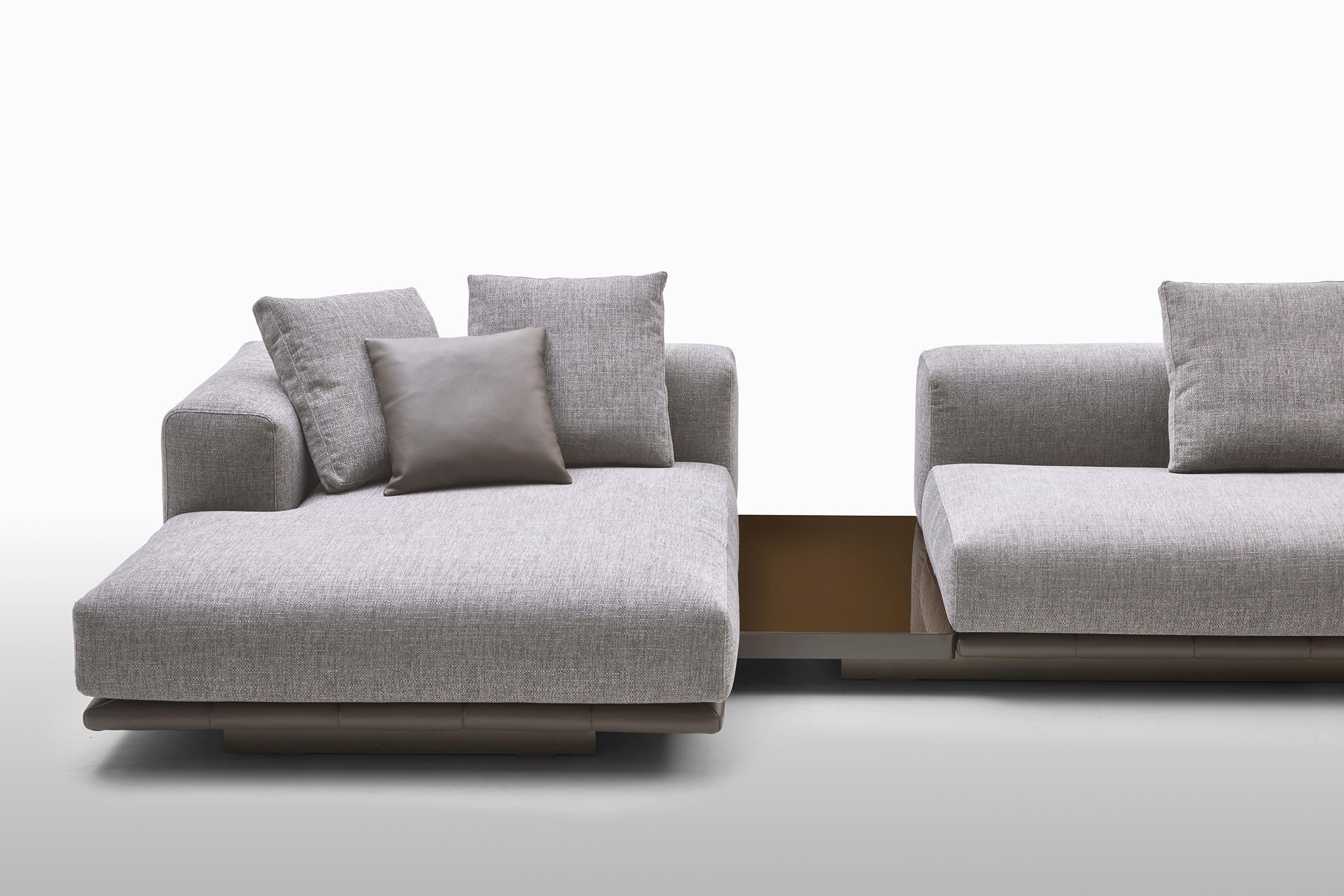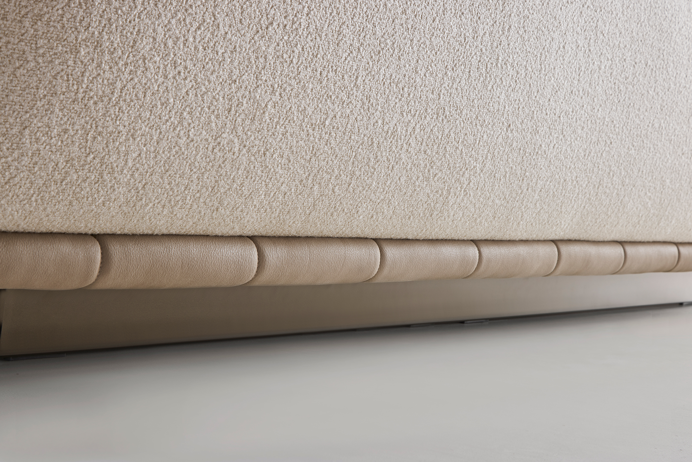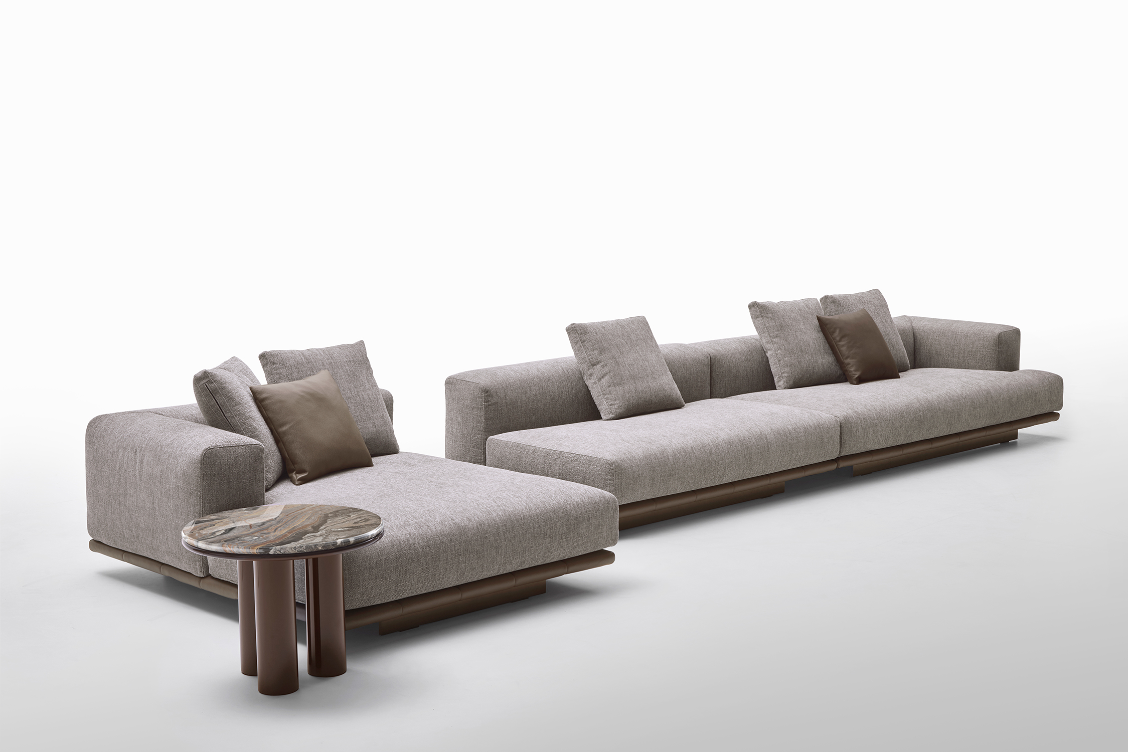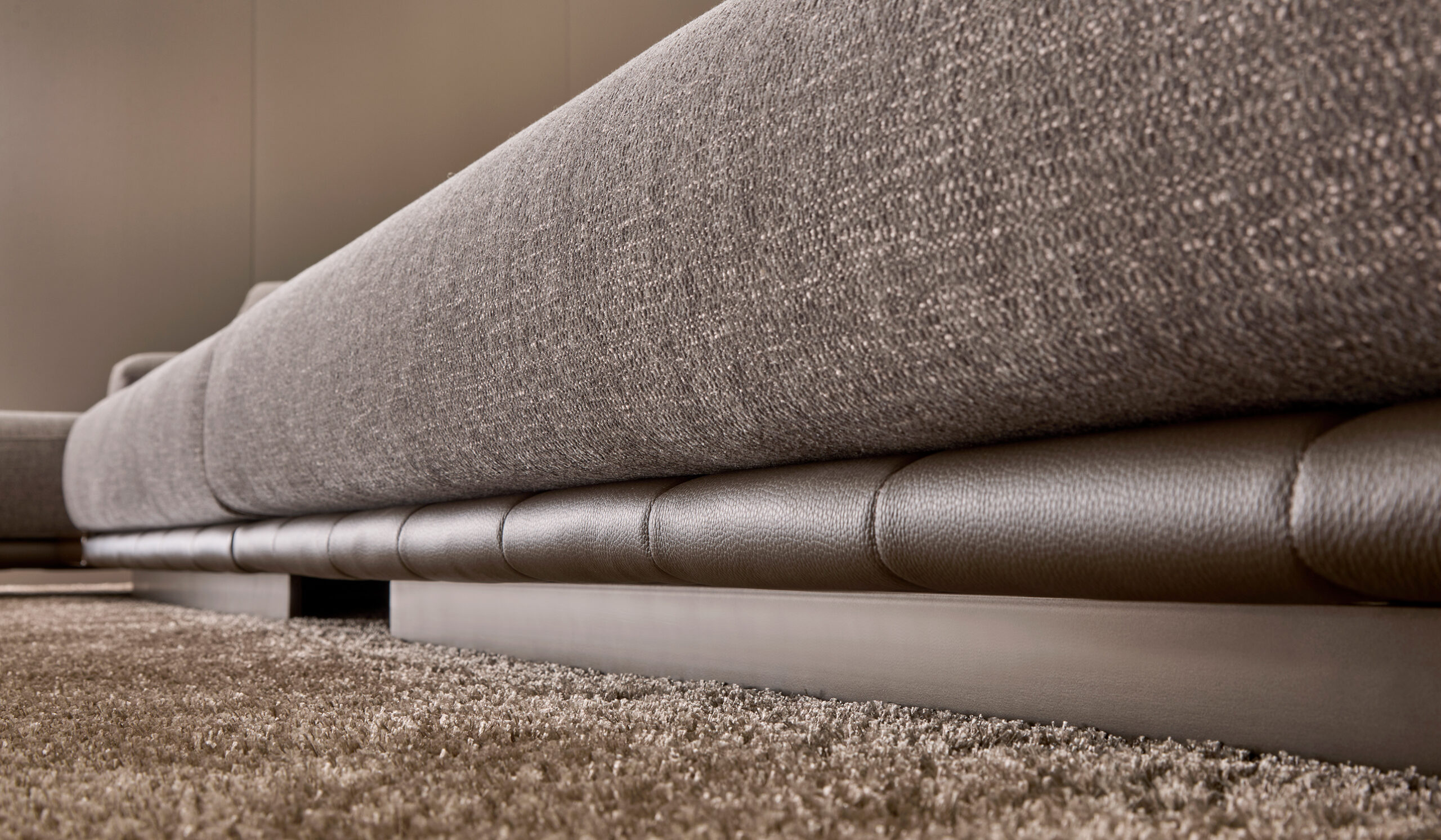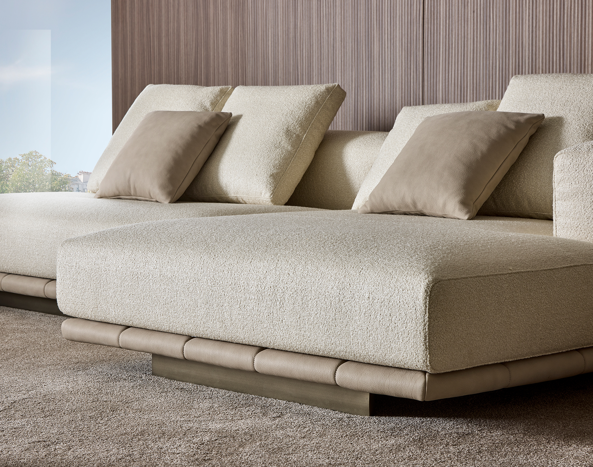 Le sedute ampie e profonde si combinano con schienali lineari e cuscini morbidi, creando un equilibrio perfetto tra rigore formale e sensazione di relax. La base trapuntata, sottile e leggera, caratterizza visivamente l’insieme.