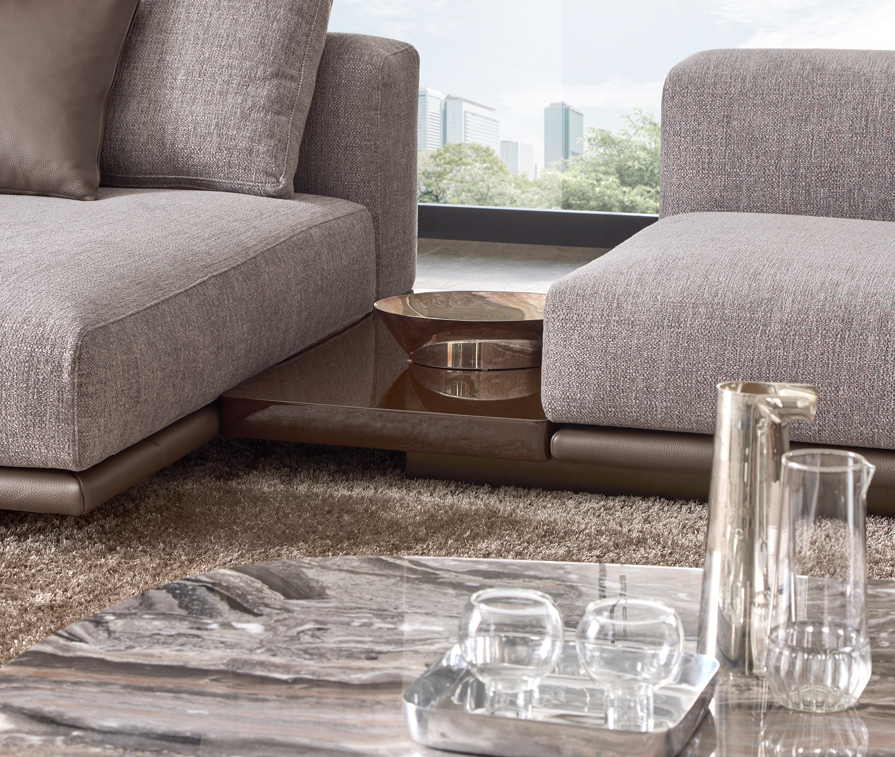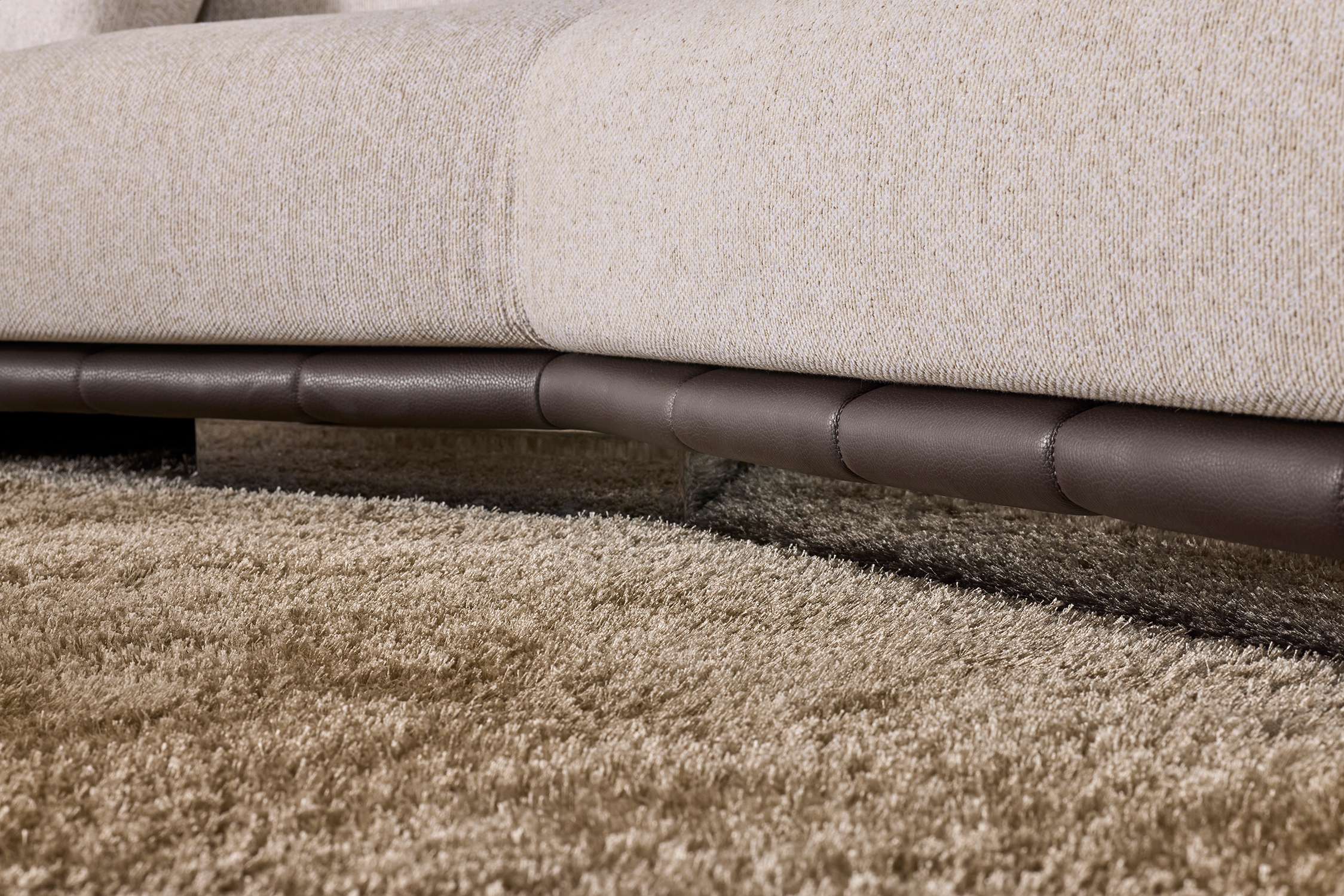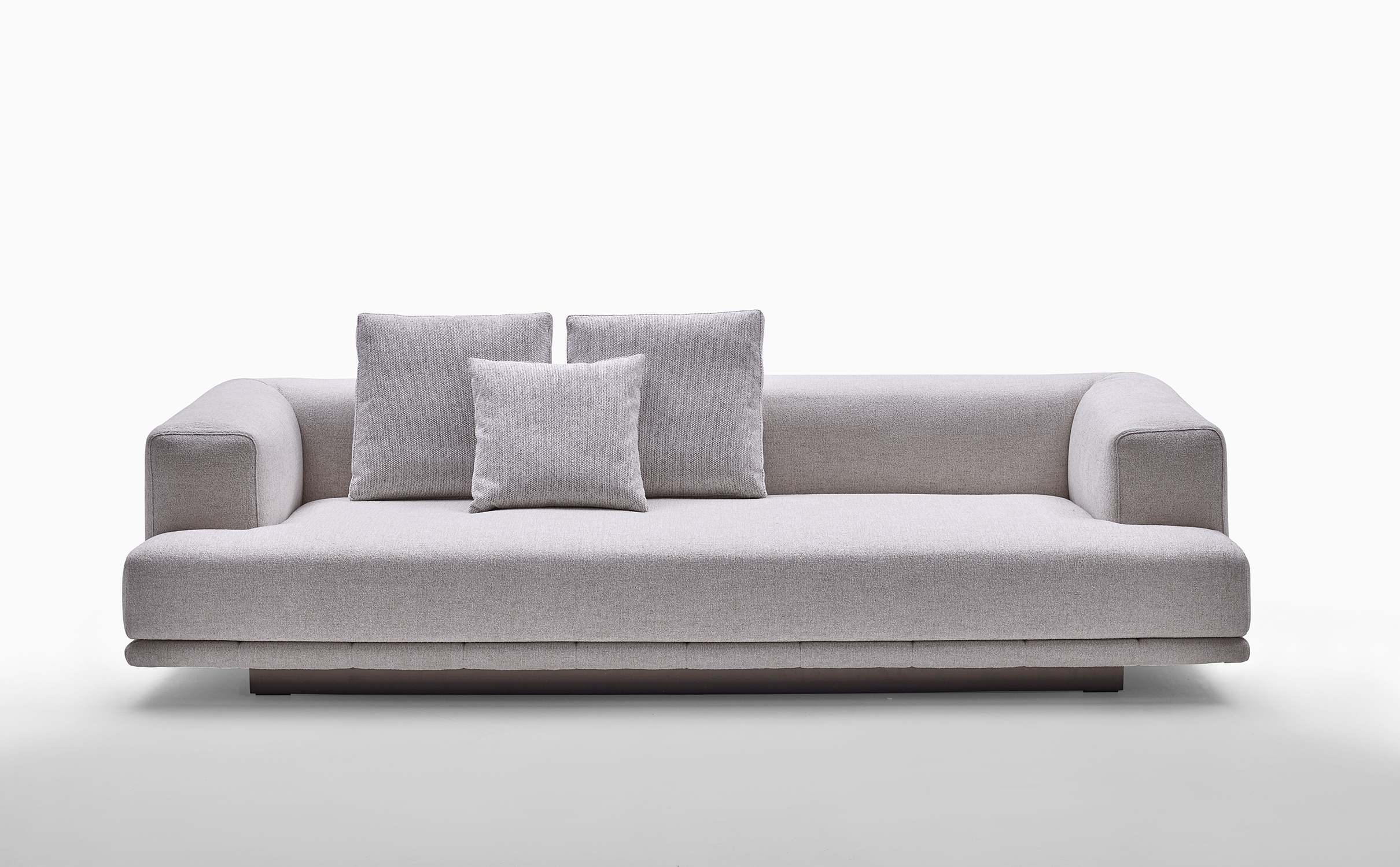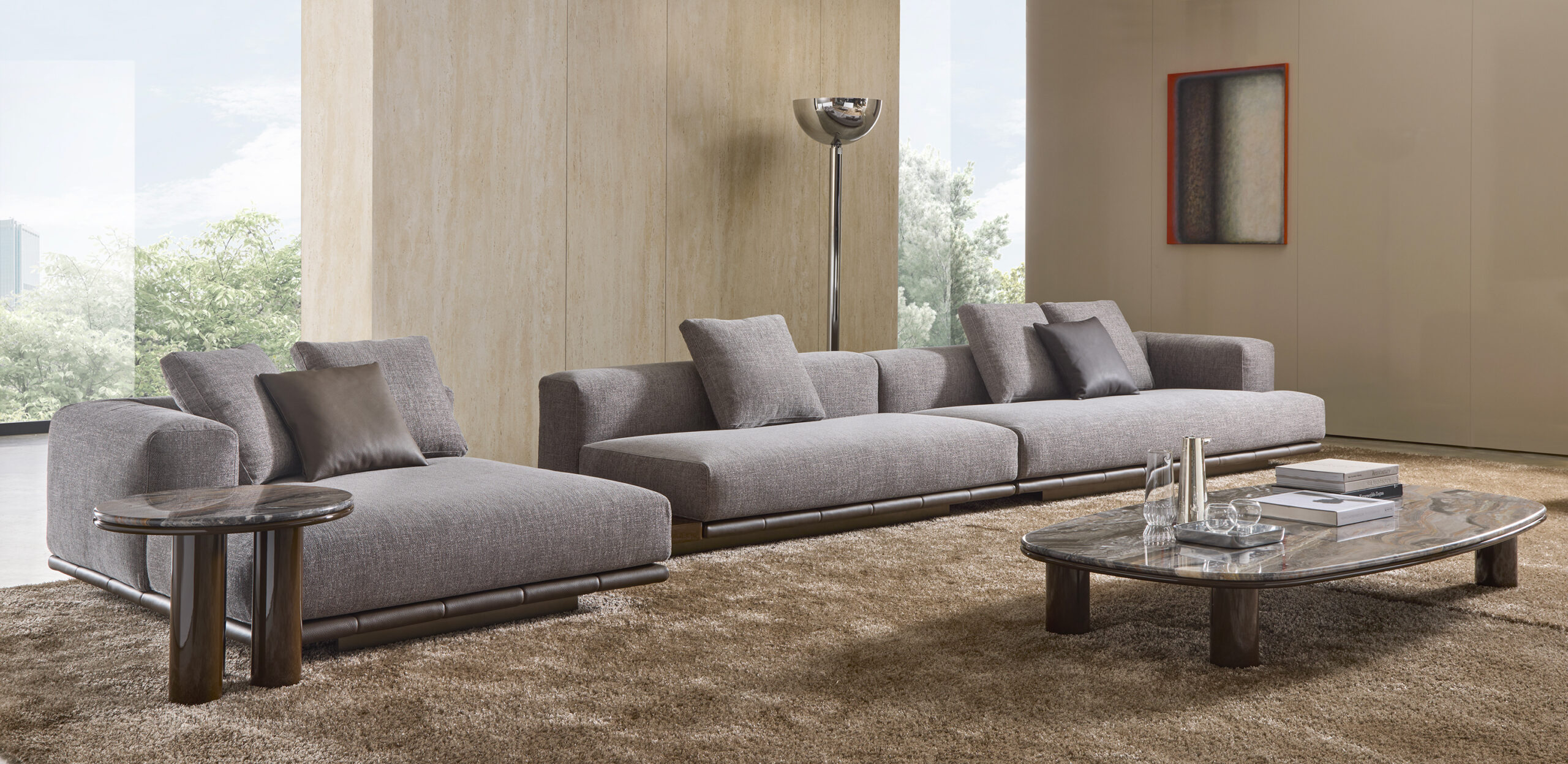Le sedute ampie e profonde si combinano con schienali lineari e cuscini morbidi, creando un equilibrio perfetto tra rigore formale e sensazione di relax. La base trapuntata, sottile e leggera, caratterizza visivamente l’insieme.