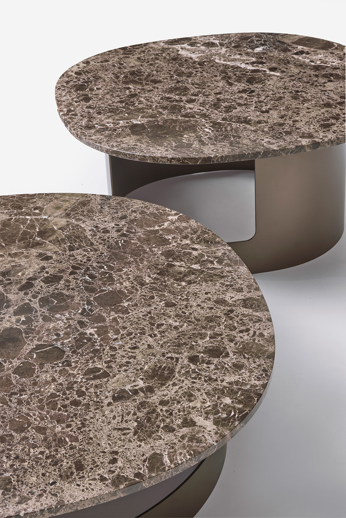 È possibile optare per un top in marmo, oppure grès porcellanato o vetro. La base è realizzata in metallo, il quale può essere personalizzato con una vasta gamma di finiture disponibili nel catalogo. Tuttavia, le finiture spazzolate non sono disponibili per la base dei tavolini Kofi.