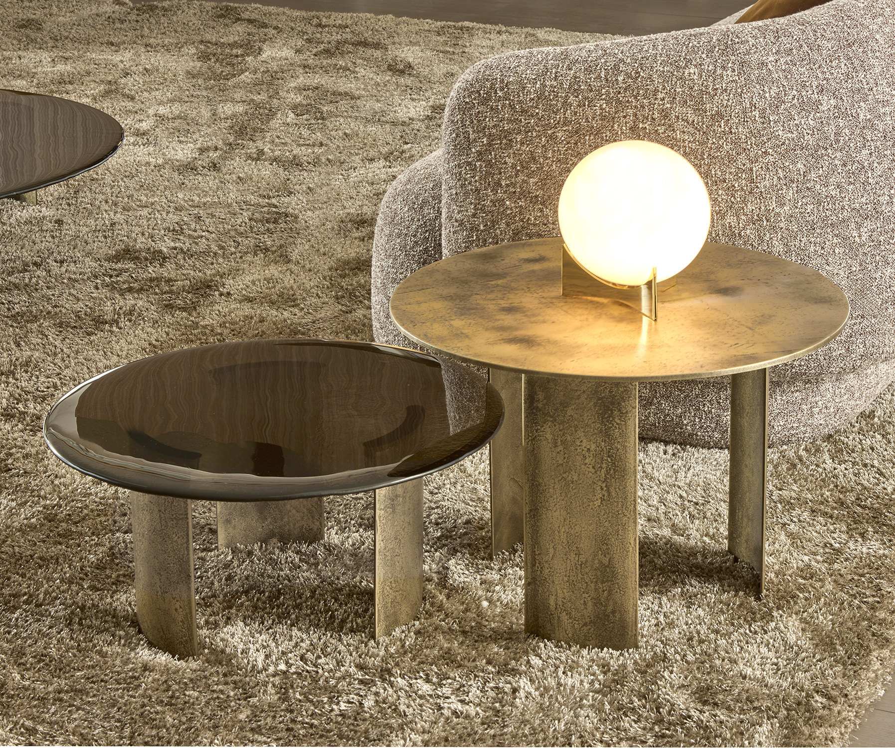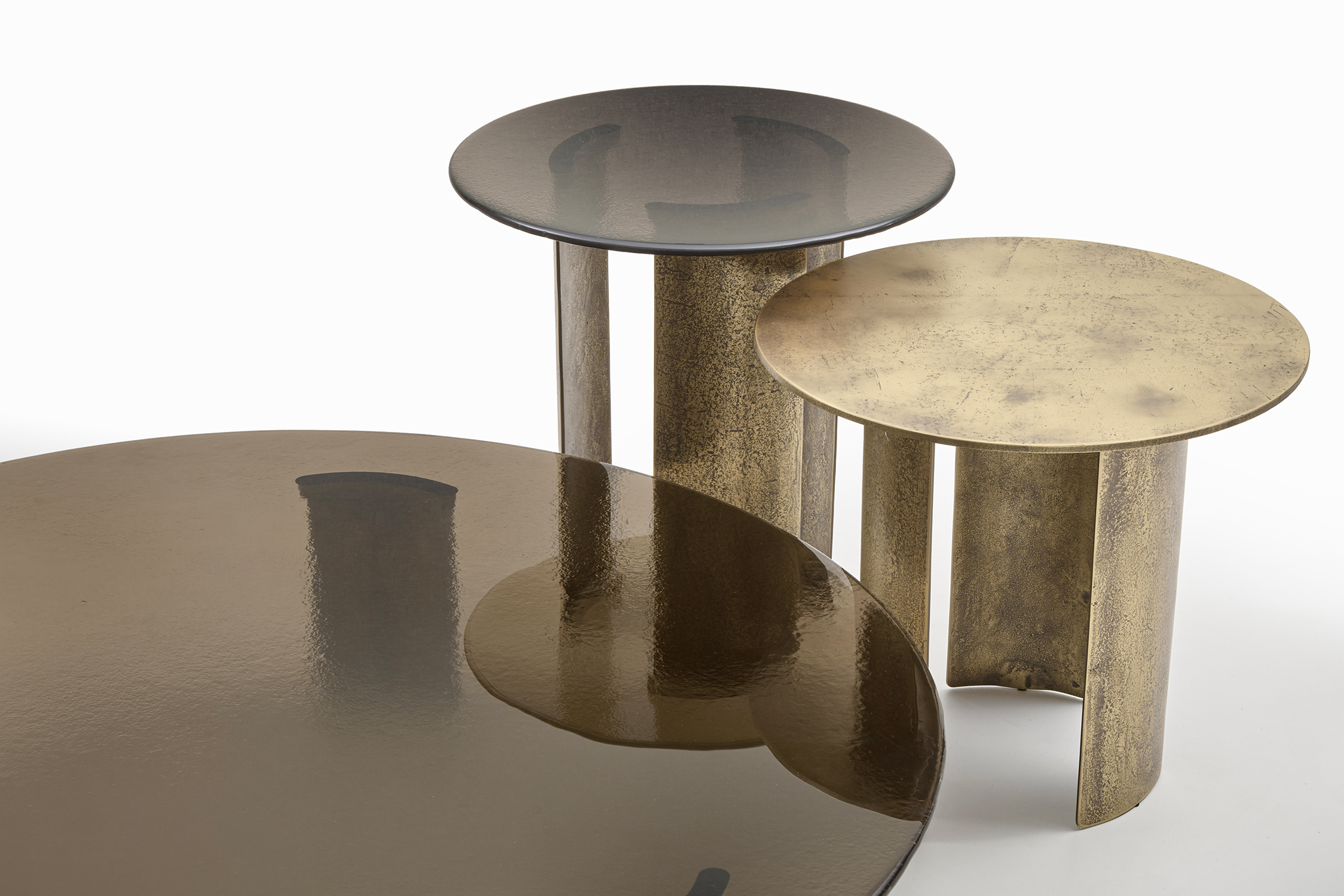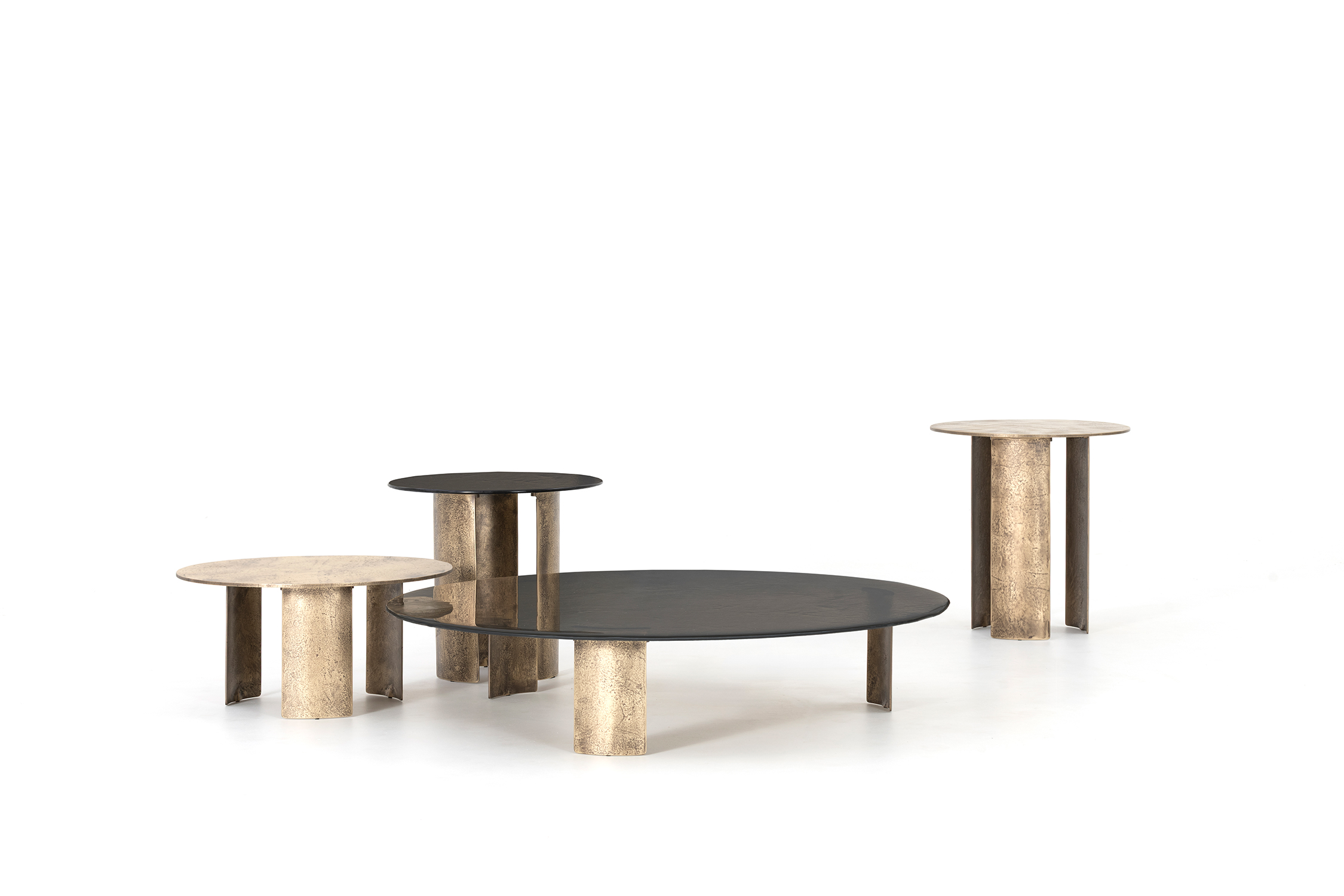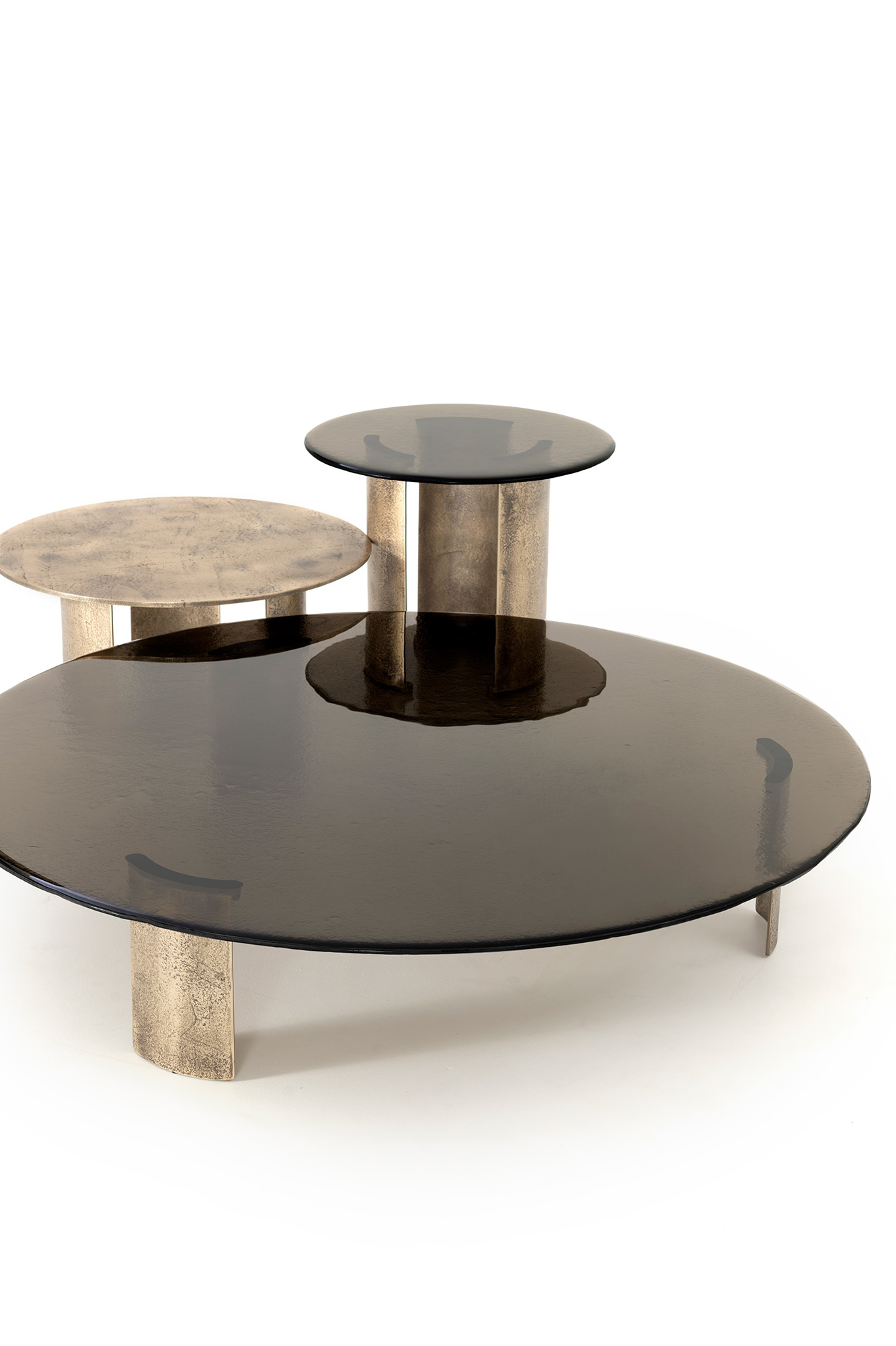Le strutture metalliche sono forgiate attraverso le tradizionali tecniche della colatura del bronzo, lavorate a mano con pazienza e maestria. La spazzolatura artigianale restituisce superfici materiche, vive, mai identiche, rendendo ogni tavolino un pezzo unico e irripetibile. Una presenza che vibra, che dialoga con la luce e lo spazio.
