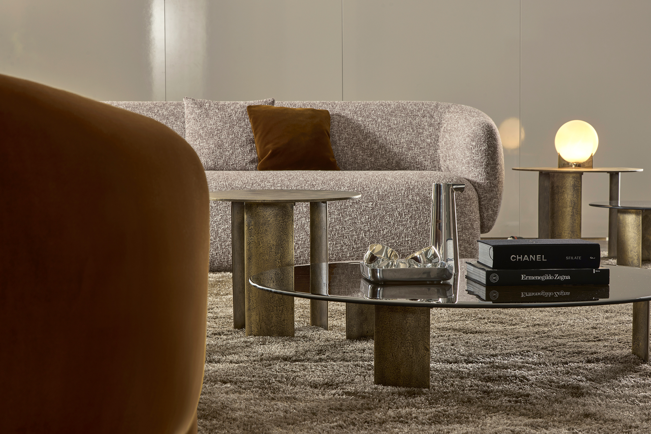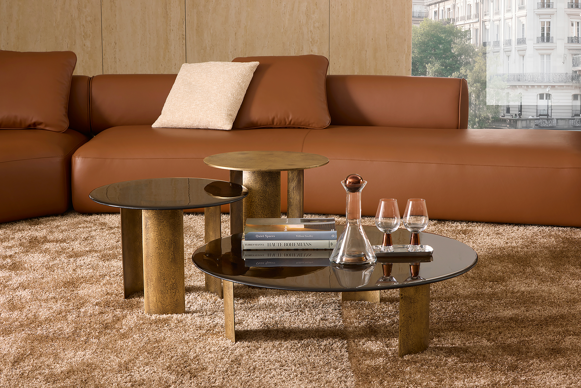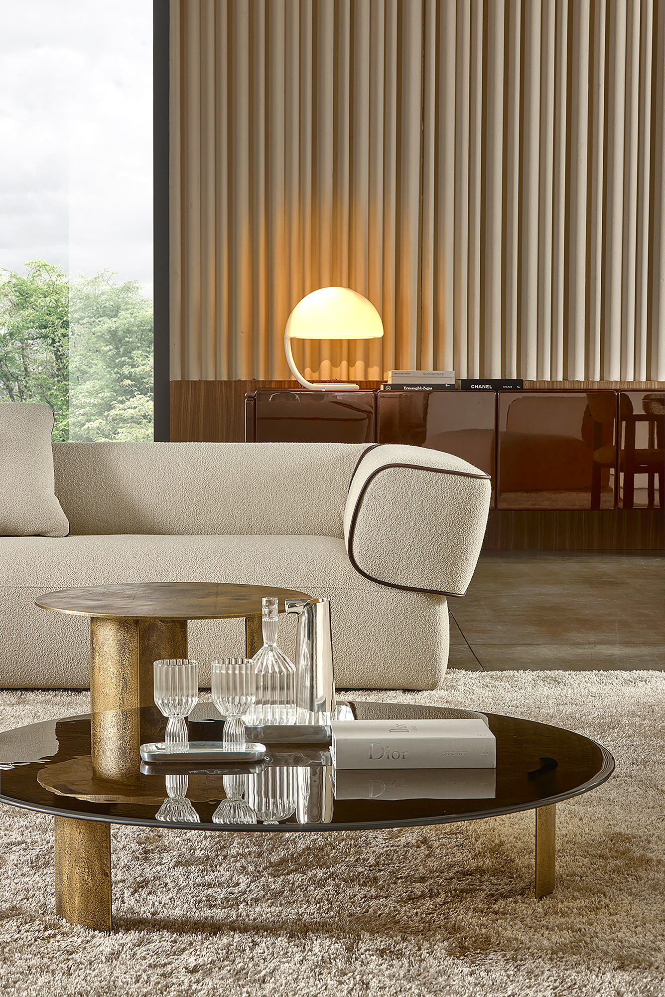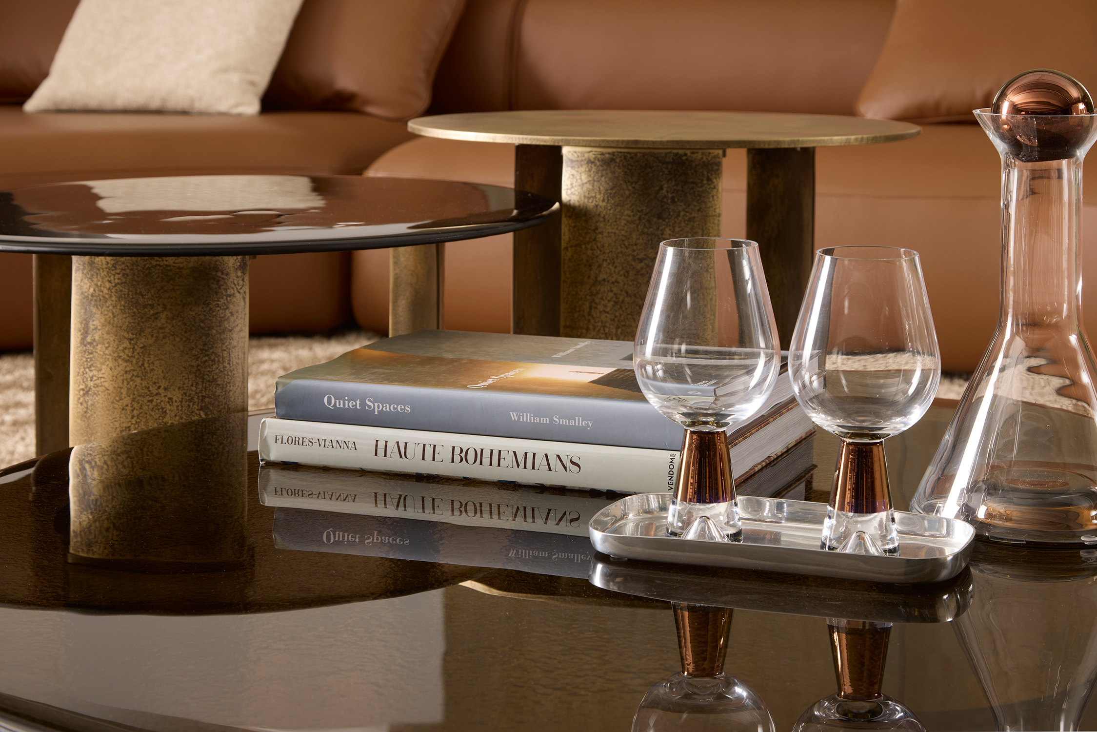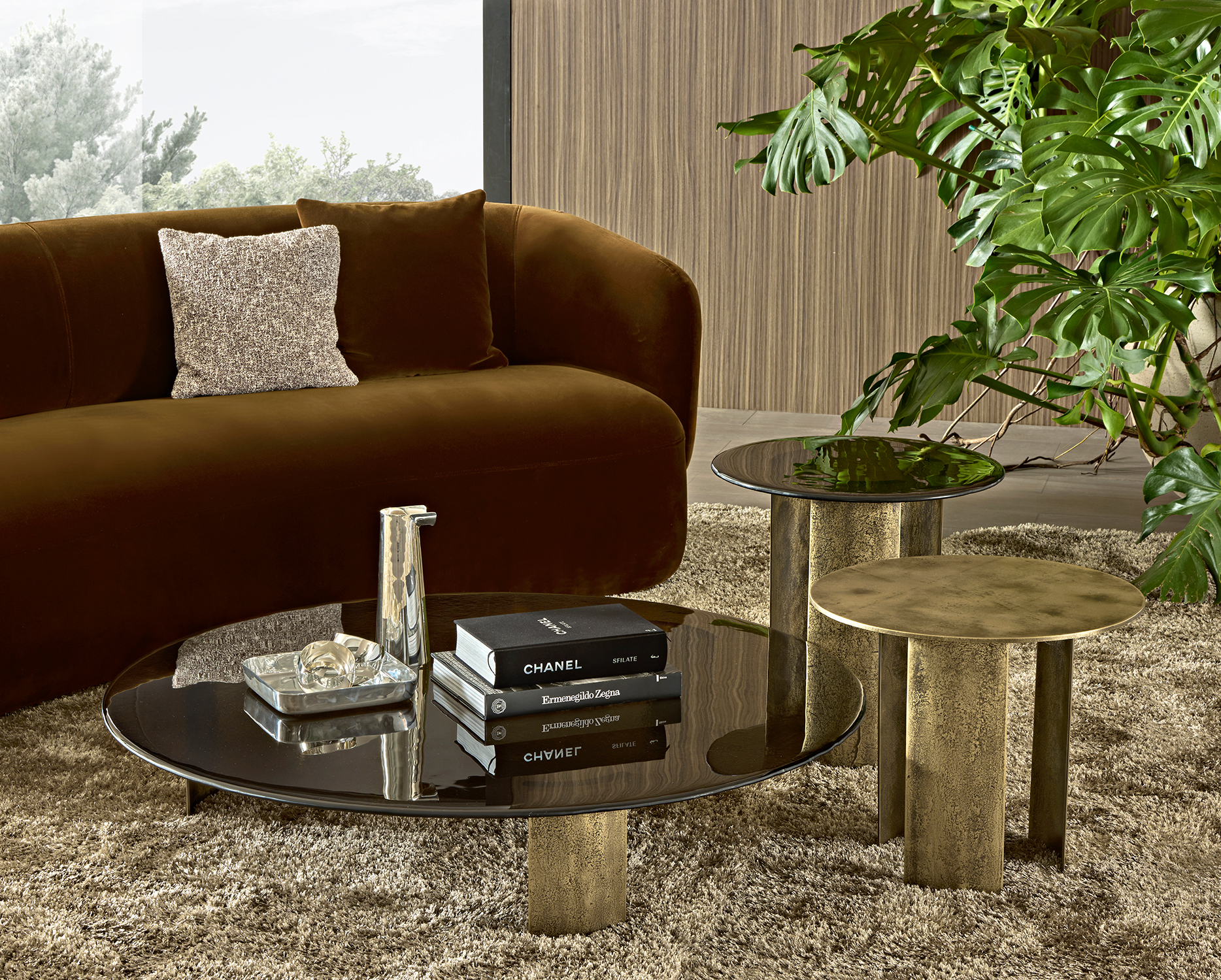 Le strutture metalliche sono forgiate attraverso le tradizionali tecniche della colatura del bronzo, lavorate a mano con pazienza e maestria. La spazzolatura artigianale restituisce superfici materiche, vive, mai identiche, rendendo ogni tavolino un pezzo unico e irripetibile. Una presenza che vibra, che dialoga con la luce e lo spazio.