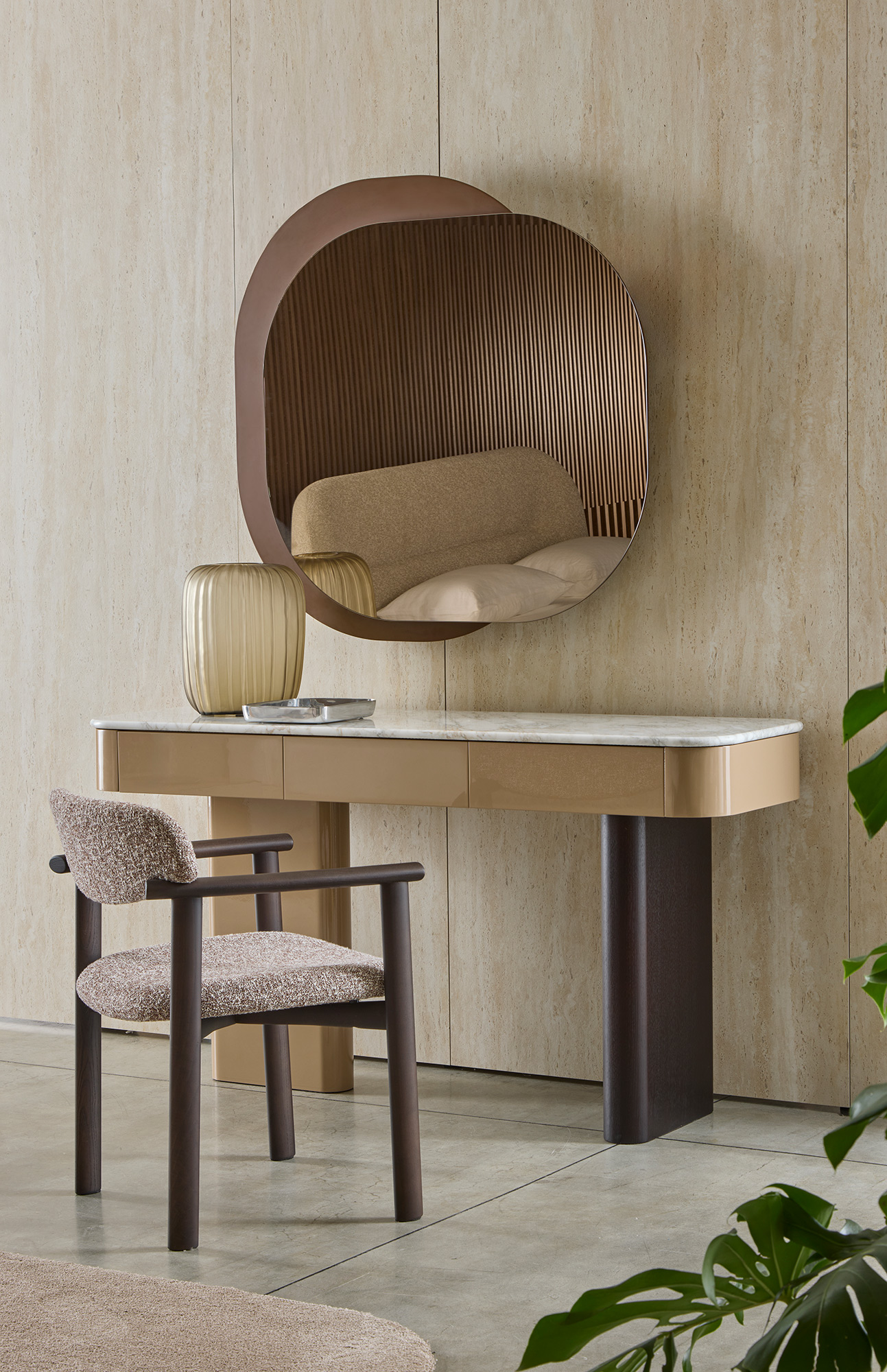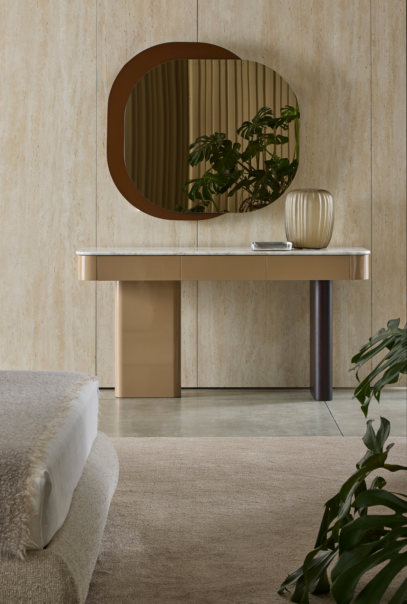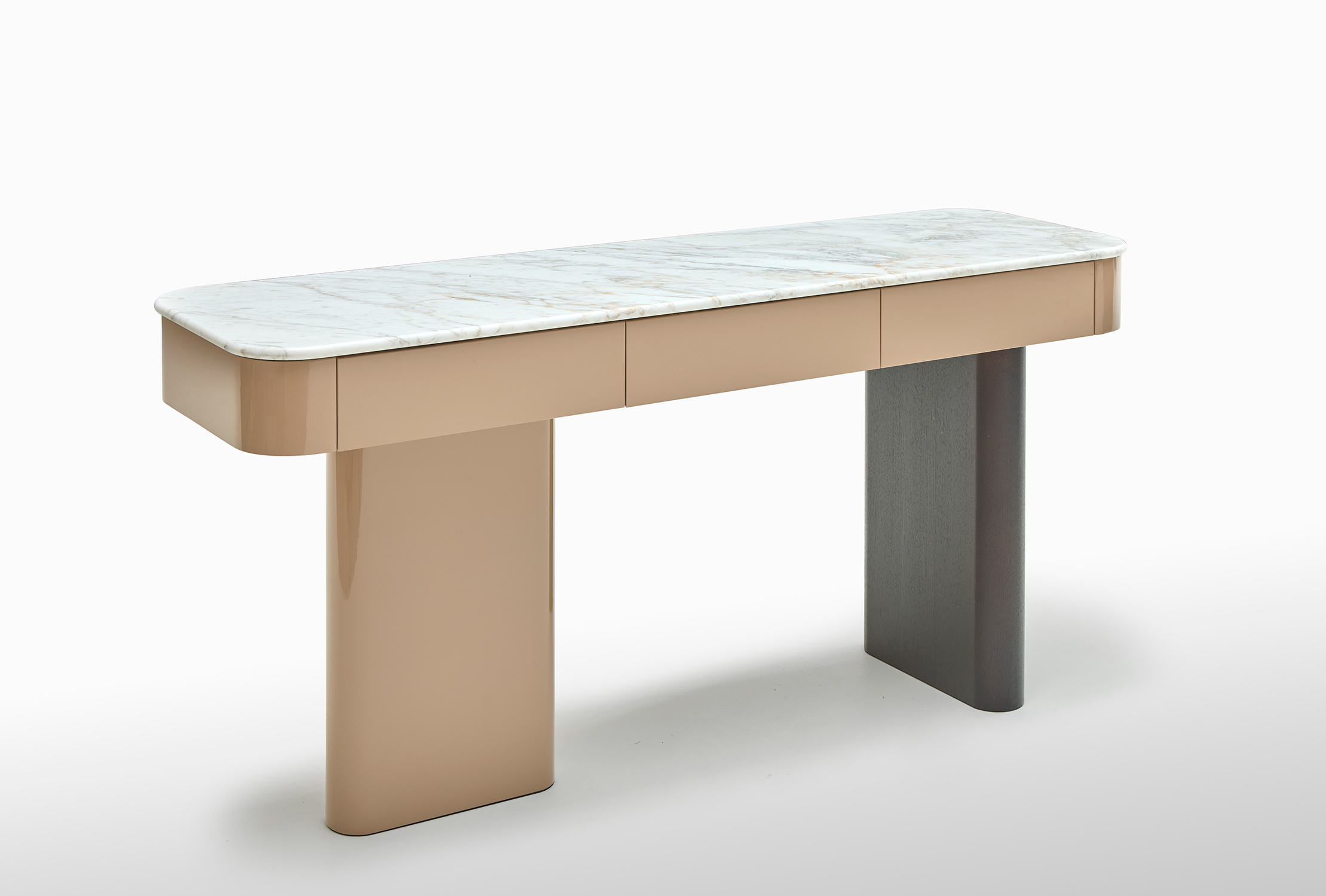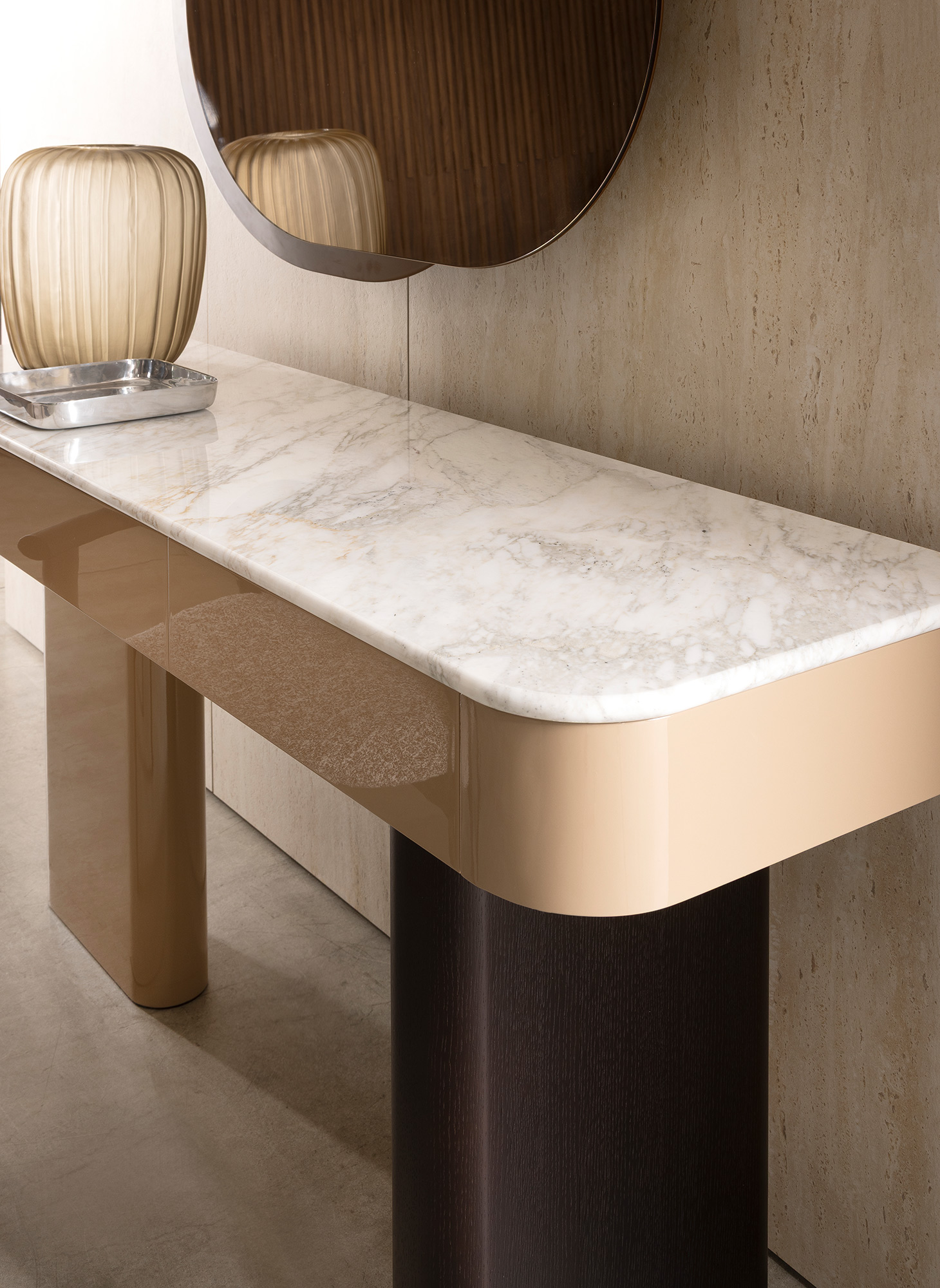 La consolle Onno evolve con versatilità: grazie all’integrazione di cassetti opzionali, si trasforma in un elegante vanity, ideale per la zona notte o per spazi dedicati alla cura personale, mantenendo coerenza stilistica e purezza formale.