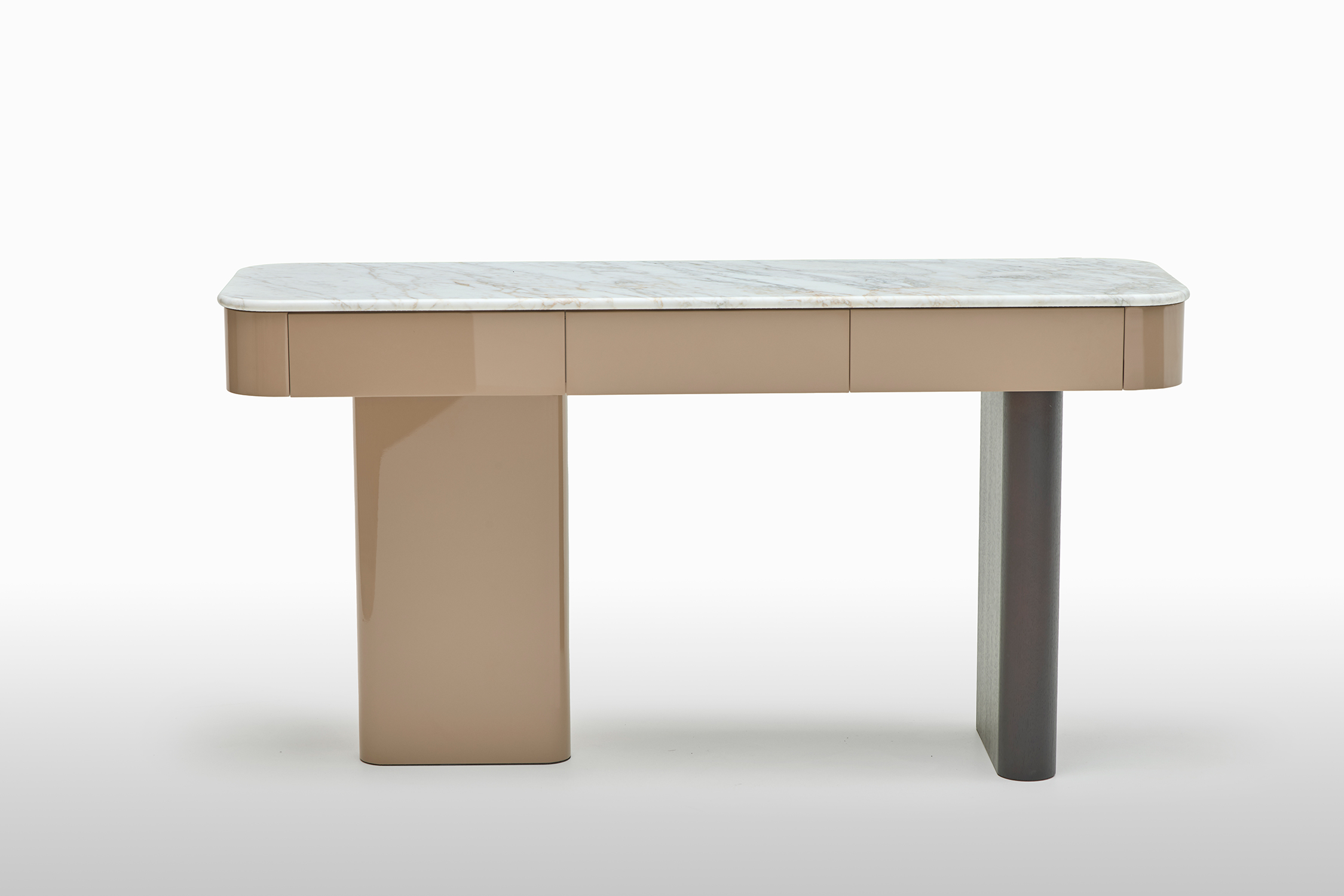 Elemento iconico del progetto sono le gambe stondante, che attraverso un raffinato gioco di volumi creano un contrasto armonico con la sottile leggerezza del piano. Una sintesi perfetta tra solidità e fluidità, pensata per ambienti contemporanei e sofisticati.