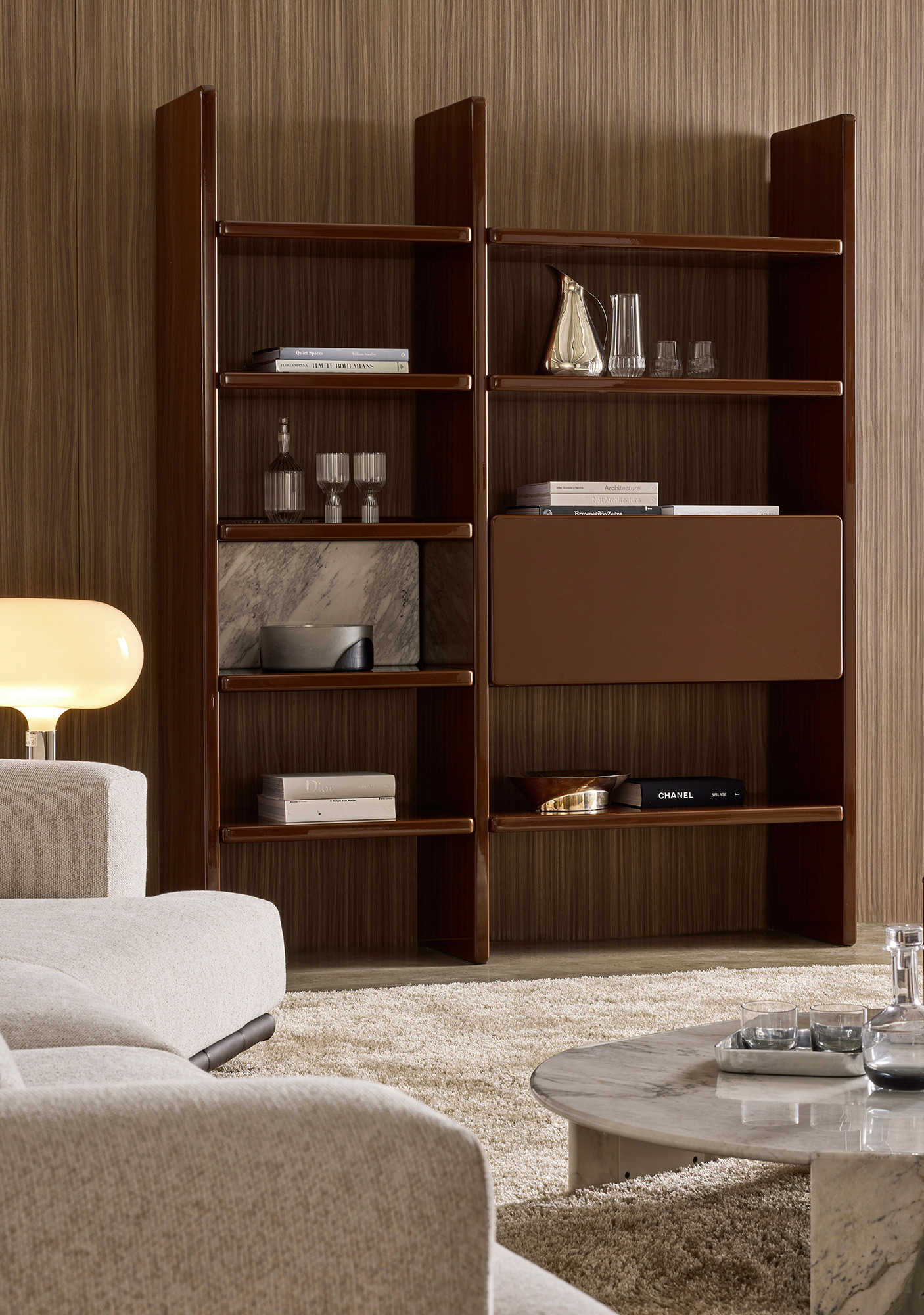 La cifra distintiva di Pierre risiede nella purezza delle geometrie: montanti e ripiani di forte spessore tracciano una griglia architettonica aperta, capace di dialogare con l’ambiente con discrezione o di diventarne protagonista. Un sistema che interpreta il design minimalista con una presenza scenica decisa, ideale per interni contemporanei, living eleganti e zone notte ricercate.