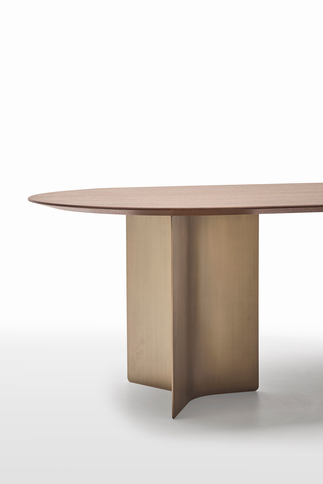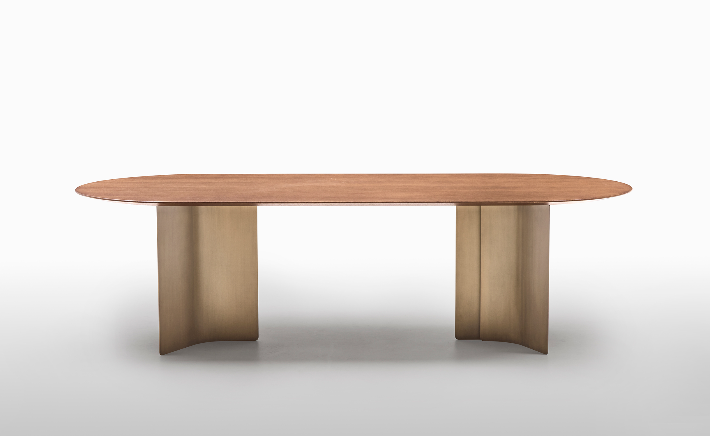 Le basi in acciaio, proposte nelle nuove e sofisticate finiture metalliche Delabrè o Peltro, aggiungono ulteriore ricercatezza e assicurano solidità strutturale senza appesantire l’estetica complessiva.