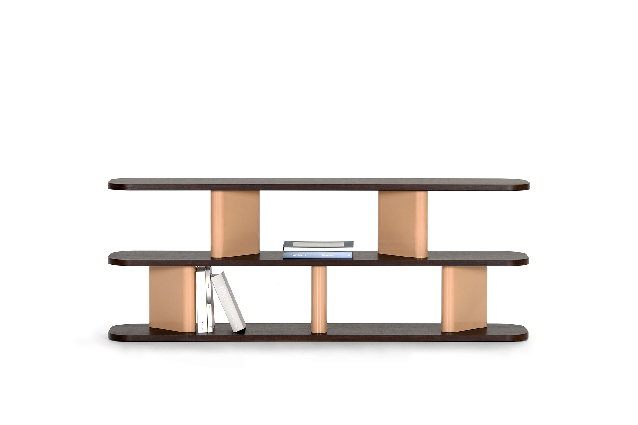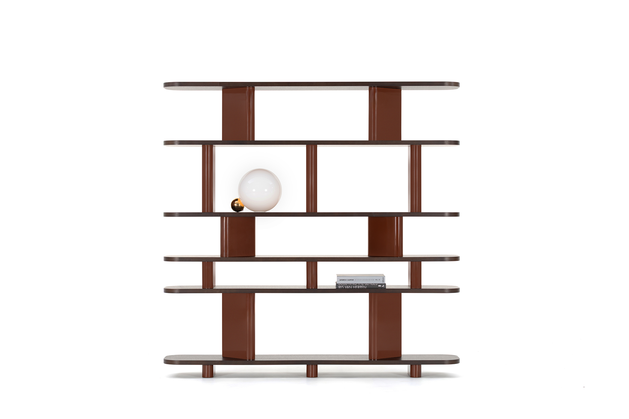 A distinctive feature is the possibility to customise the wooden shelves, offering over 15 different types of finishes to choose from. This choice allows you to adapt the bookcase to your own style and preferences, creating a unique and customised décor. In addition, the vertical elements can be lacquered gloss or matt, or painted with a delabré or pewter metallic finish.