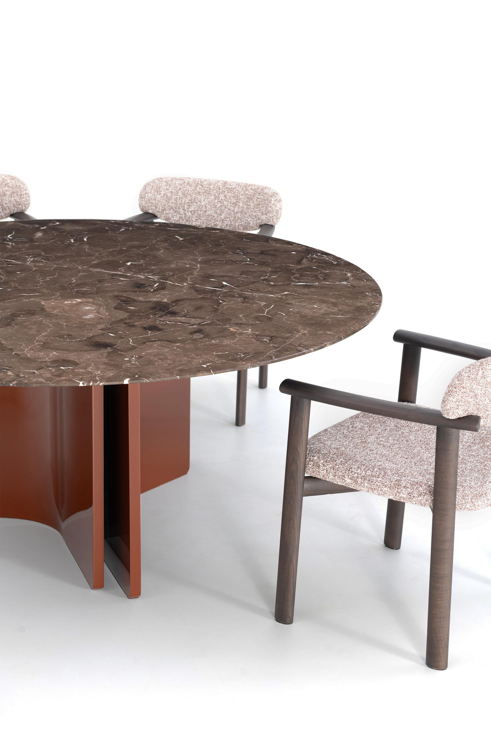 Die Tischplatten sind in 18 edlen Marmorsorten in rechteckiger oder runder Form erhältlich und bieten eine breite Palette an Anpassungsmöglichkeiten an unterschiedliche stilistische Kontexte. Die Wahl des Marmors unterstreicht die Raffinesse der Kollektion und verleiht ihr eine zeitlose Eleganz.